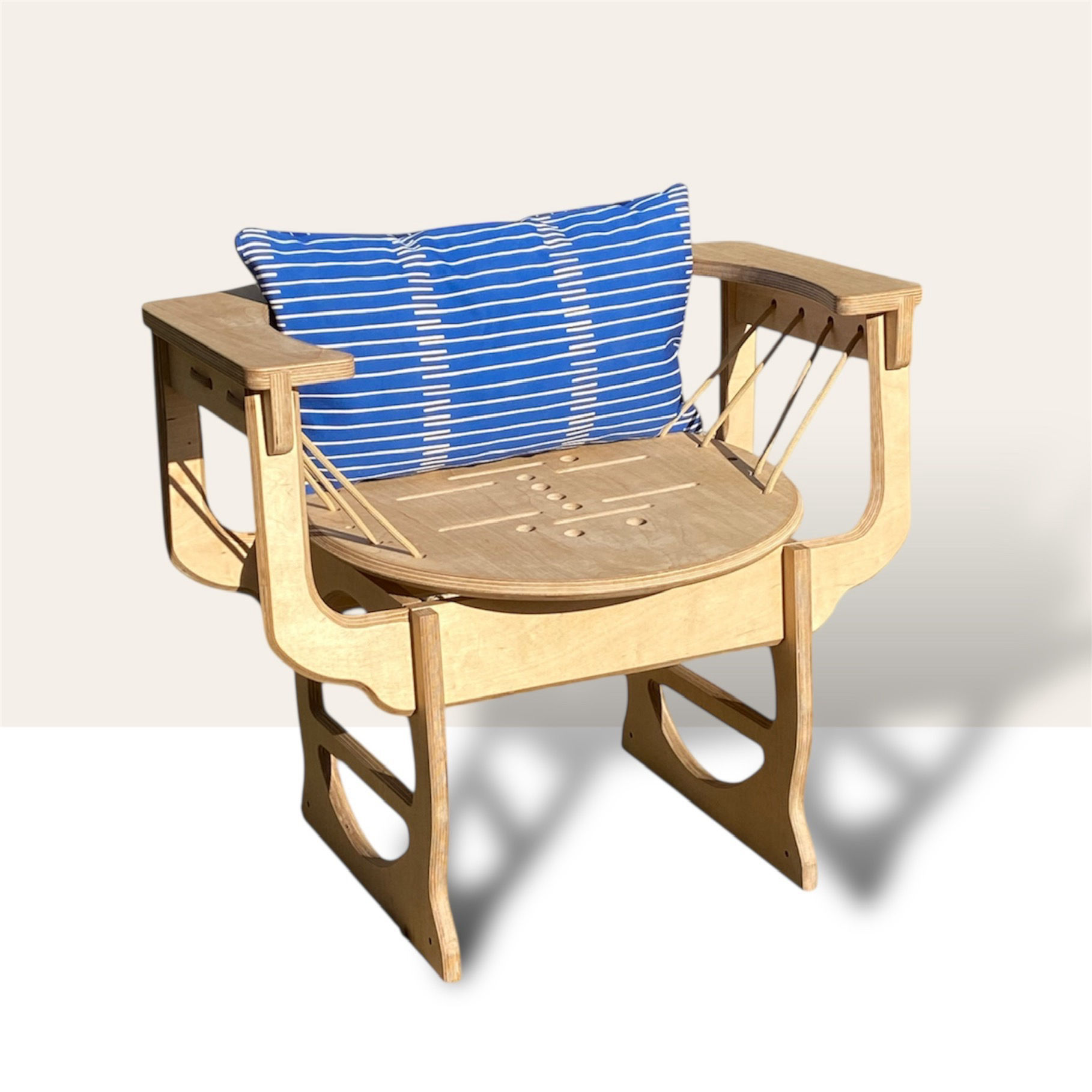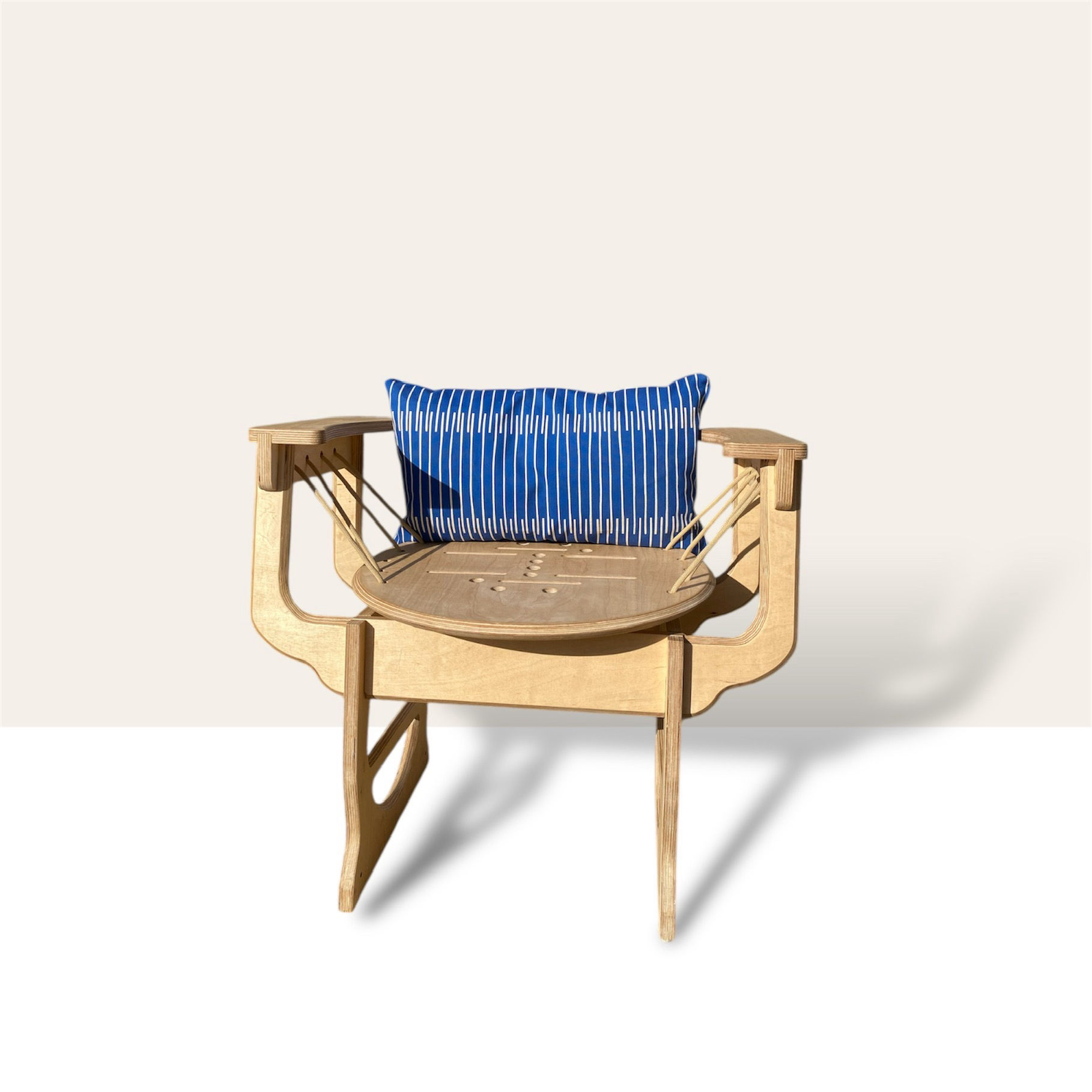 Le fauteuil Swing est un siège singulier dont l’assise se présente sous la forme d’un large plateau circulaire, généreux et accueillant. Celui-ci est délicatement suspendu grâce à un cordage marin, choisi pour sa robustesse, son esthétique brute et son rapport intime avec l’univers nautique.