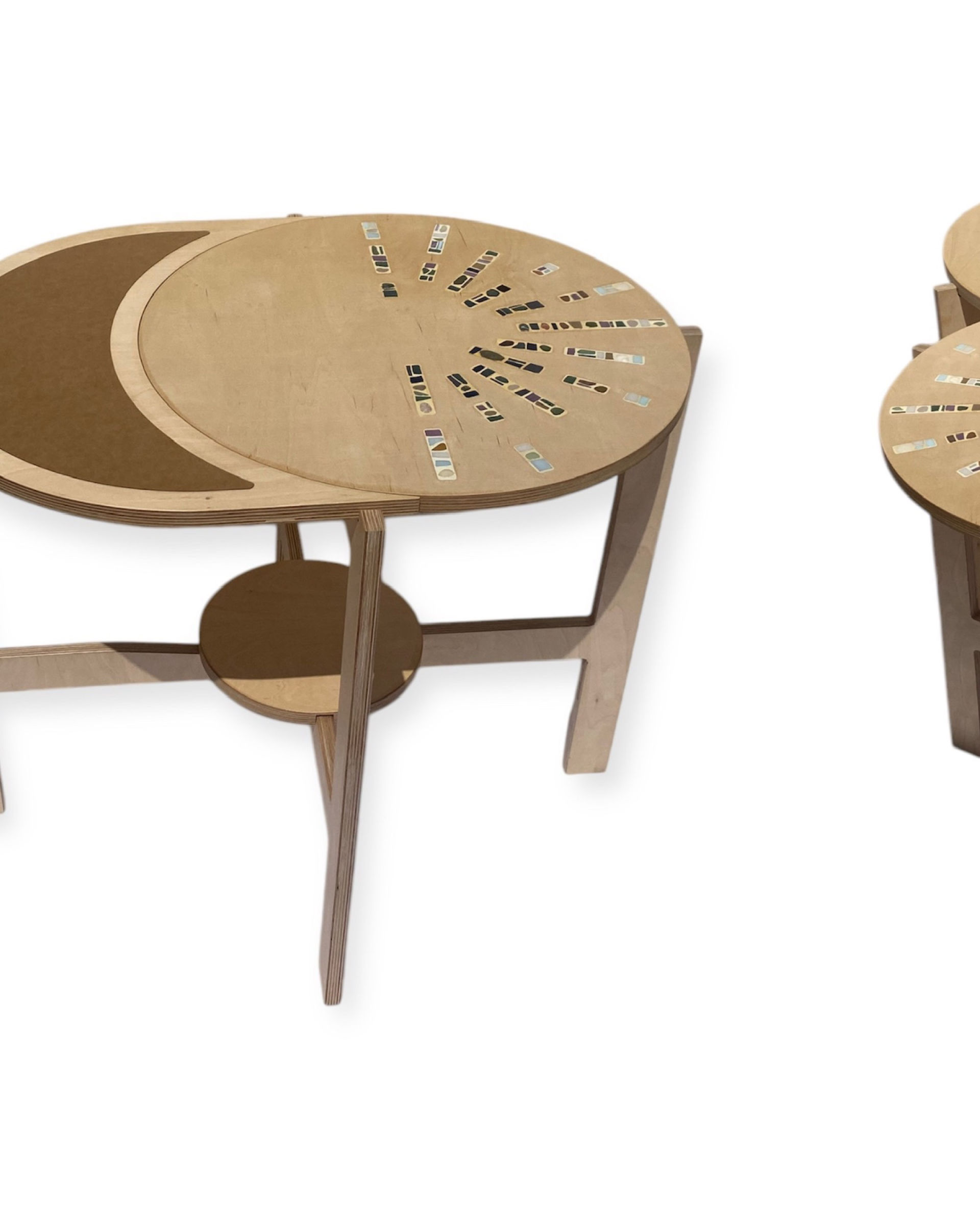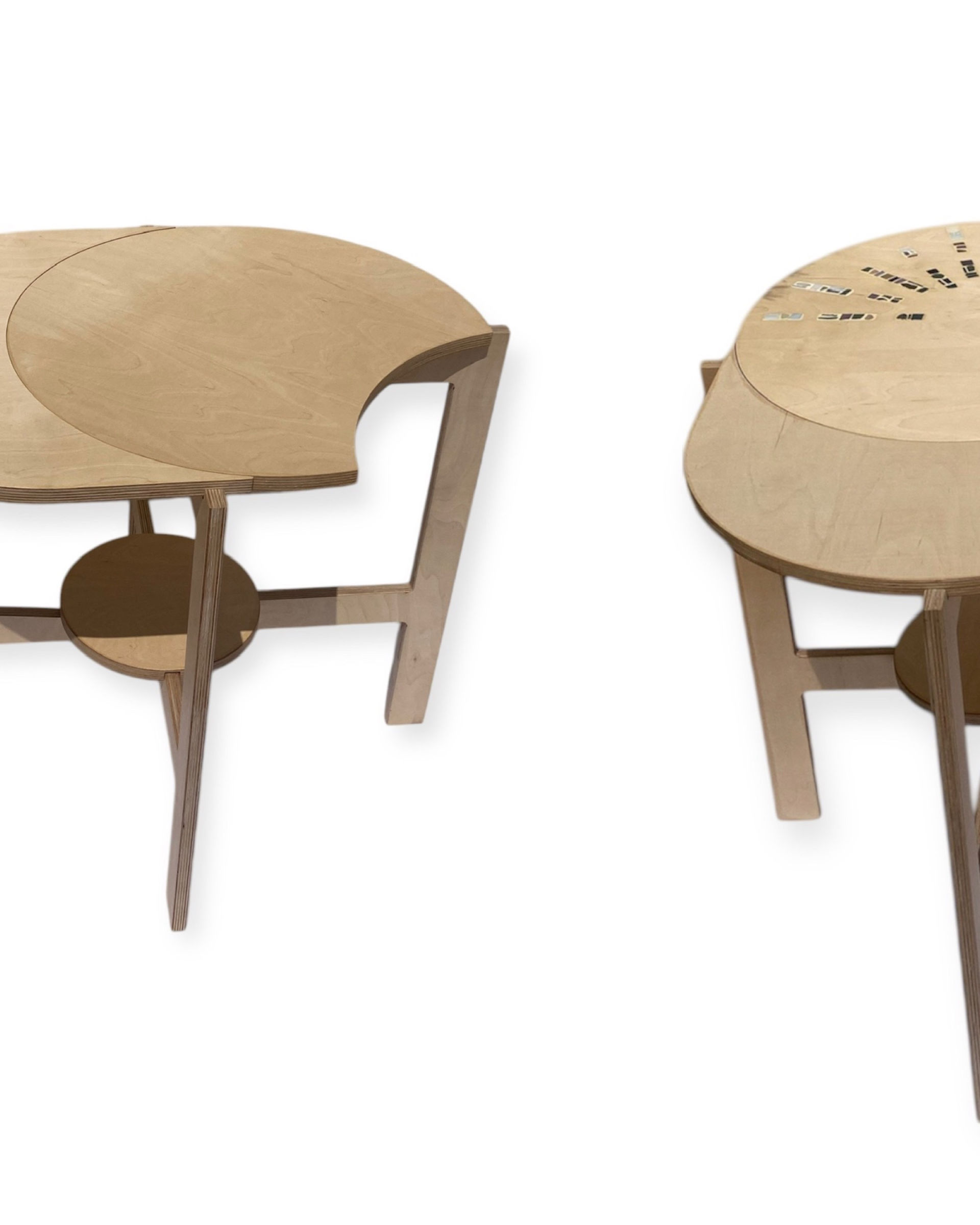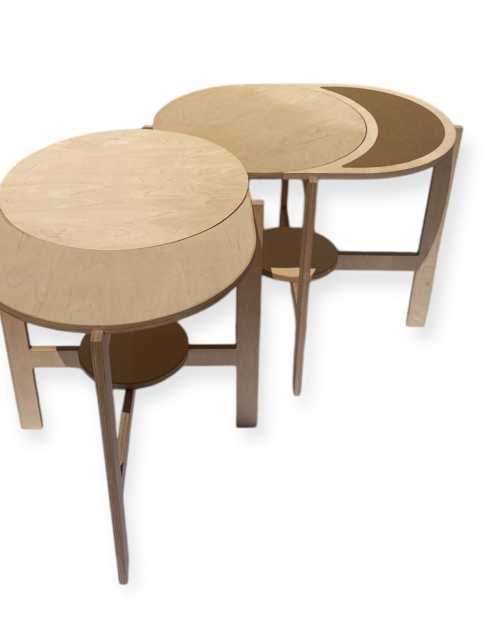 Avec leurs formes ronde et en quartier de lune, les plateaux se combinent librement pour former différentes configurations : en ligne, en triangle, ou toute autre disposition qui s’adapte à votre espace et à vos envies.